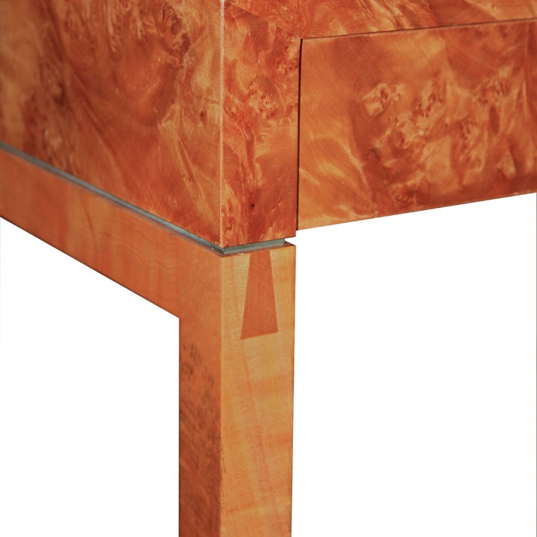 This is a large contemporary desk, which features stunning bookmatched Burl Myrtle. There are four slim pencil drawers under the top, which are fully dovetailed by hand.