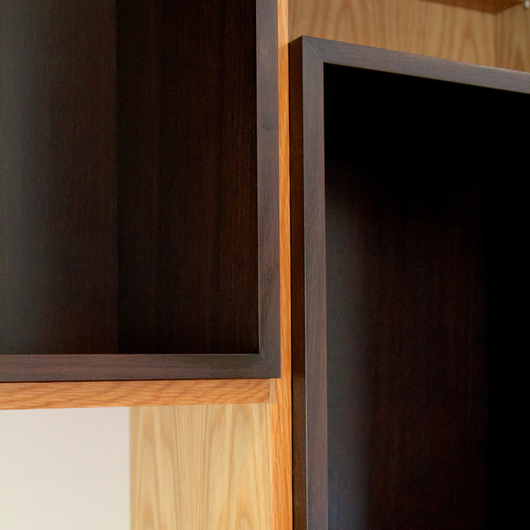 This built in wall unit was custom designed and made for a study/family room. Push to open doors on the lower section provide hidden storage, while the open shelves are for books. The darker Walnut boxes provide areas for display.